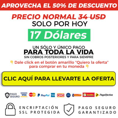 Pero NO vas a pagar 39 USD que sería un precio justo y estoy seguro que lo pagarías, HOY vas a poder acceder a tan solo 17 USD.